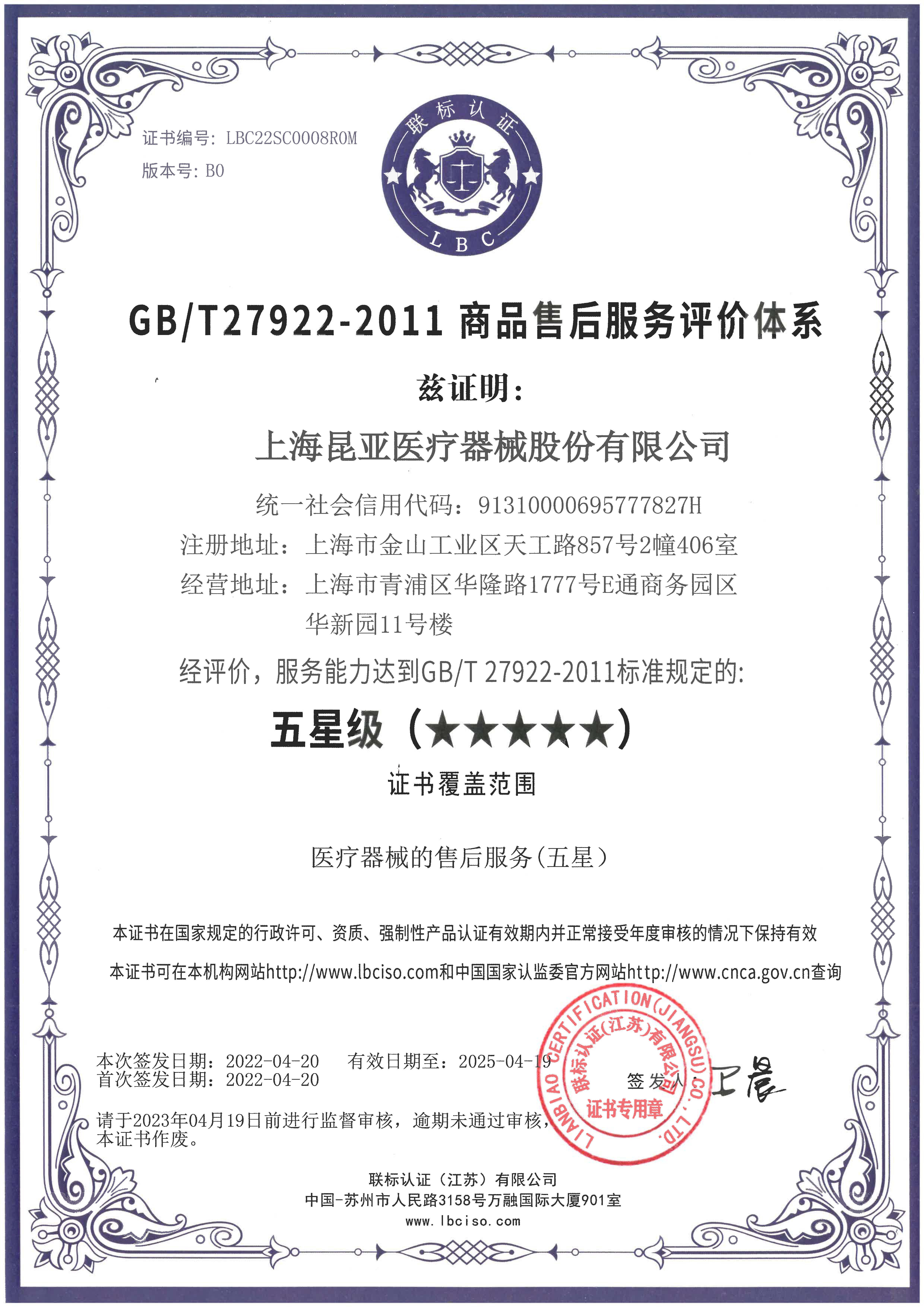 五星售后服務認證證書