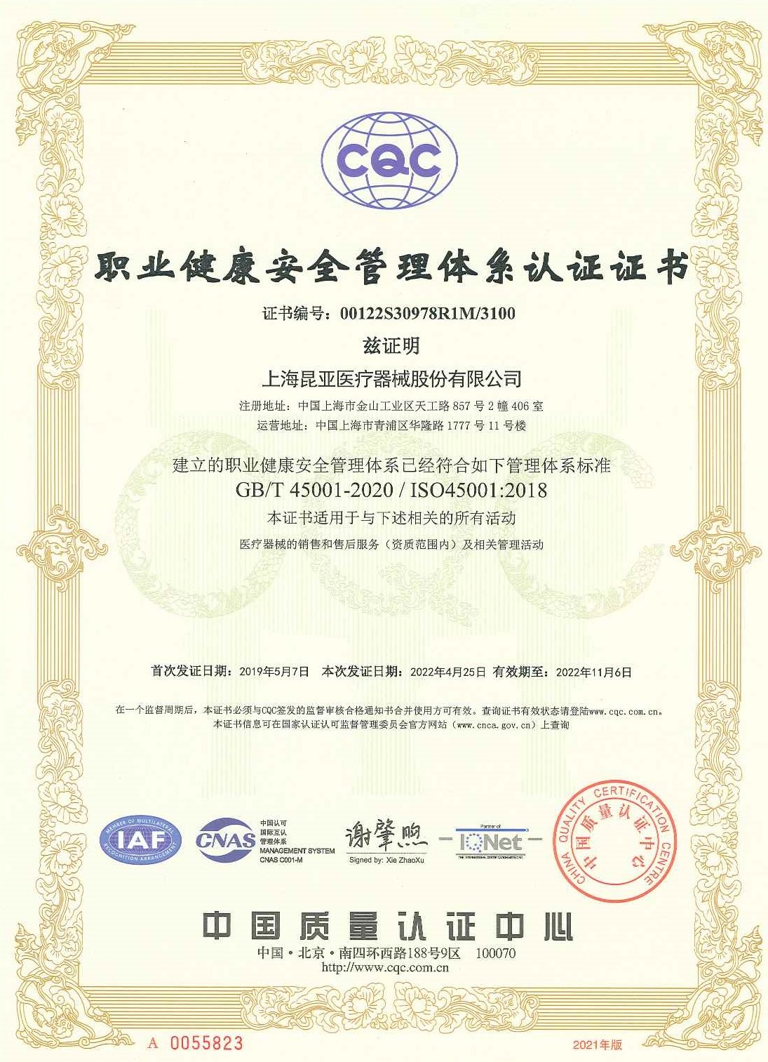 職業健康安全管理體系認證證書