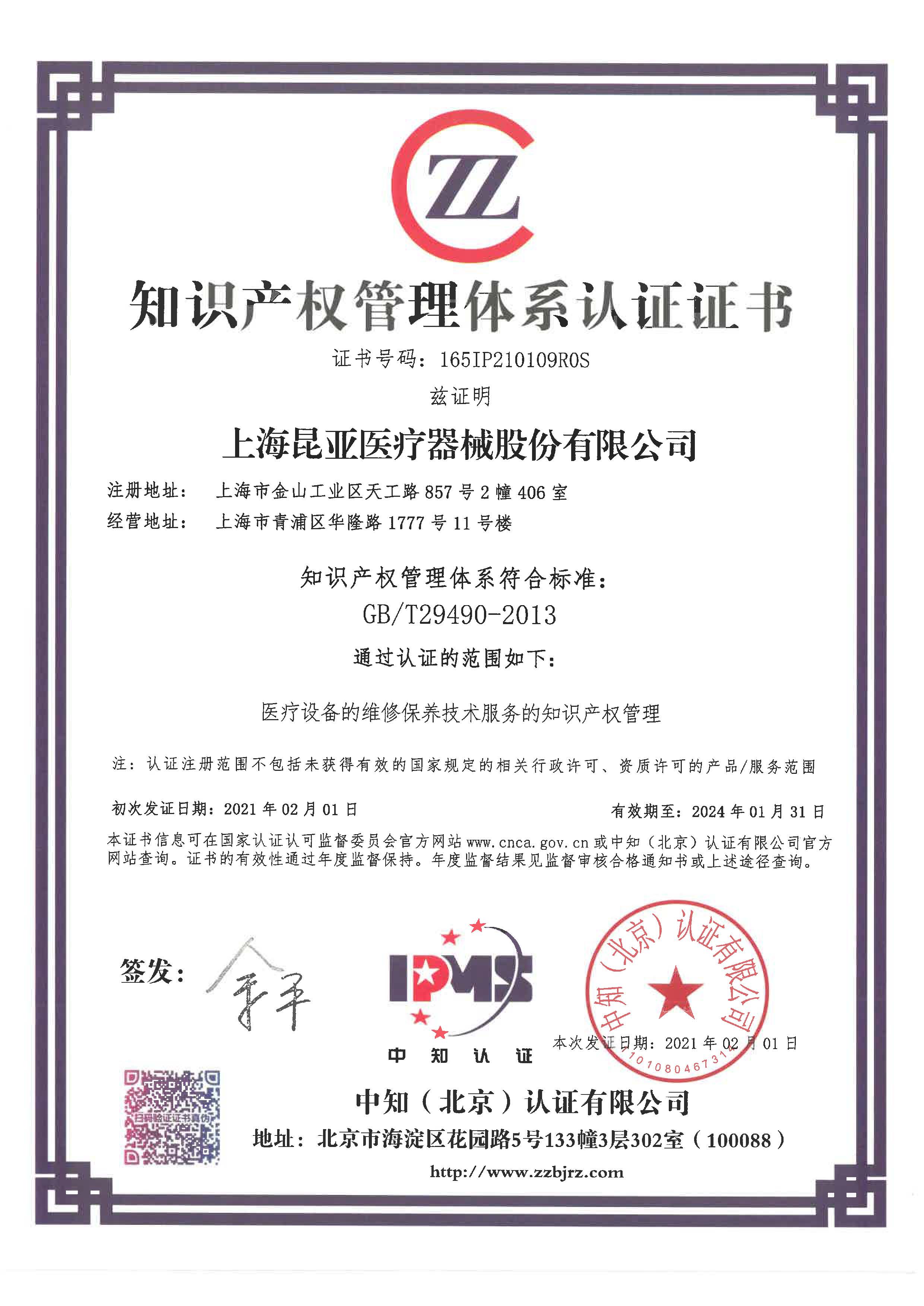 知識產權管理體系認證證書