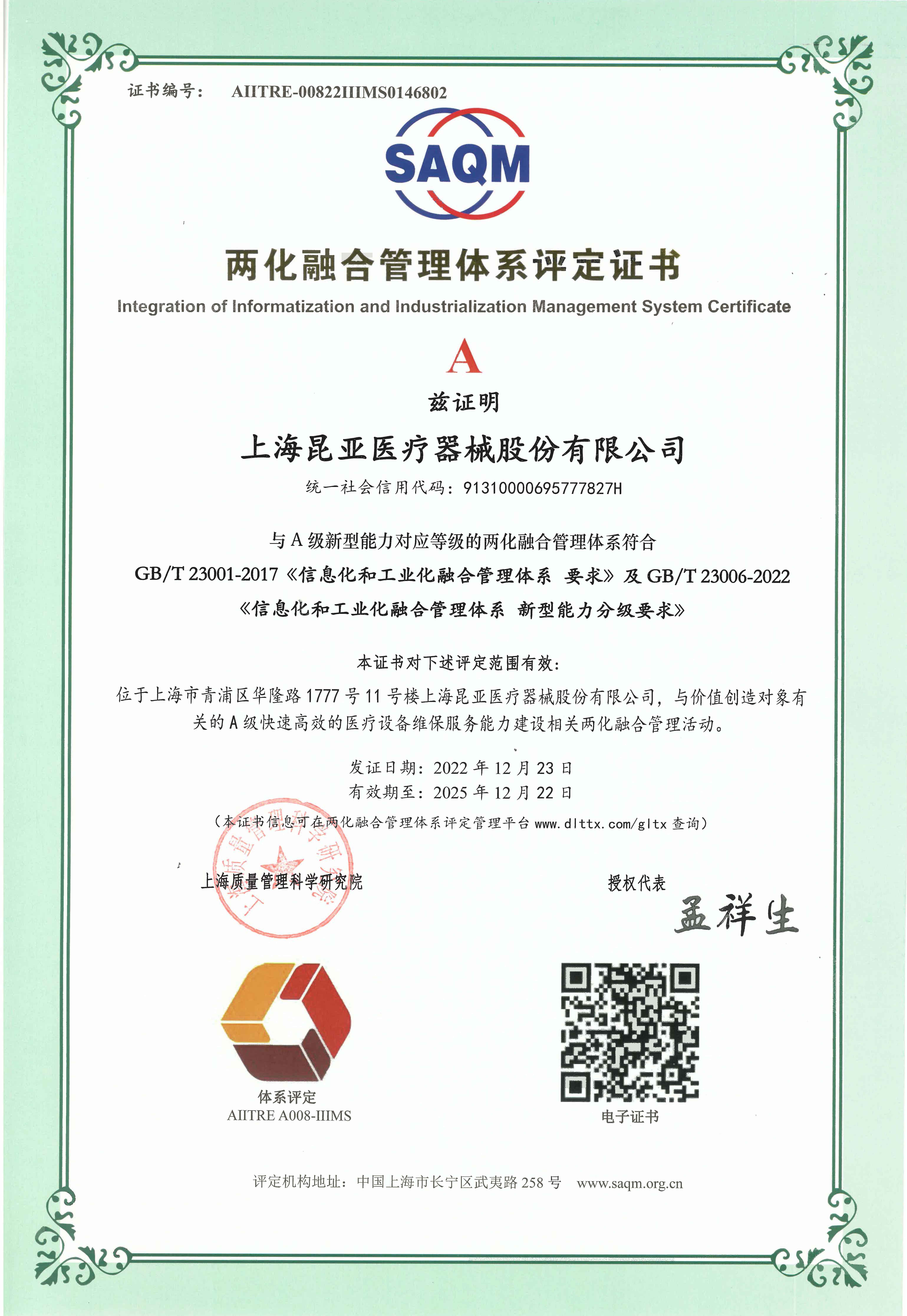 上海昆亞醫療器械股份有限公司是一家醫療設備服務平臺提供商,公司主營業務為醫院醫療設備整體提供維保外包服務,致力于全院醫療設備預防性全生命周期管理;以全面提升醫院醫療設備管理水平、臨床醫療設備使用率和開機率打造的專業化醫療設備服務平臺。 昆亞醫療,已通過ISO14001環境管理體系、ISO45001職業健康與安全管理體系、ISO9001質量管理體系、ISO13485醫療器械質量管理體系、ISO27001信息安全管理體系五大國際認證;同時,昆亞醫療為合作客戶提供設備服務保險;2017年,昆亞醫療榮獲得上海市高新技術企業稱號,并獲得上海市經信委工業互聯網創新發展專項資金支持;2019年,昆亞醫療榮獲兩化融合管理體系評定證書;2021 年,榮獲“張江之星”企業稱號、榮獲中國設備管理協會醫療行業分會廣東省培訓基地,通過企業標準管理體系認證、企業誠信管理體系認證;2022 年,昆亞醫療榮獲上海市“專精特新”企業稱號,通合規管理體系認證、反賄賂管理體系認證。。